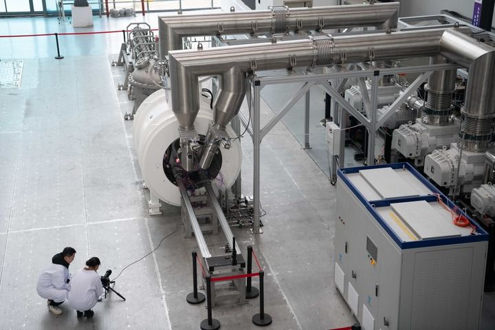 ??科研人員在位于安徽省合肥市的聚變堆主機關鍵系統綜合研究設施(CRAFT)園區內記錄強流直線等離子體裝置“赤霄”的運行狀態(2025年1月14日攝)。新華社記者 張端 攝