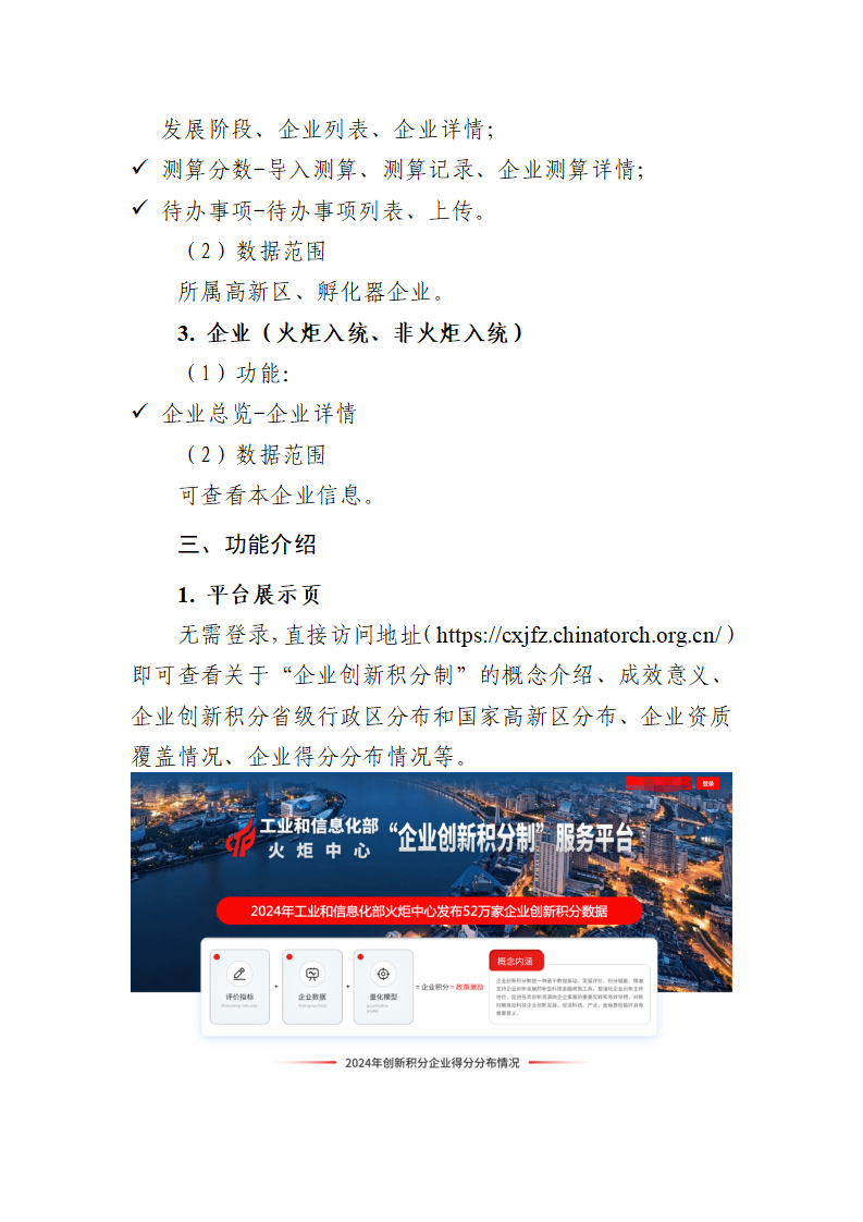 “企業創新積分制”服務平臺(https://hjrz.chinatorch.org.cn)是全面開展企業創新積分制工作的重要載體。該平臺充分發揮火炬中心業務系統數據整合優勢,通過打通政務數據通道匯集企業數據。高新技術企業和國家高新區內入統企業無需填報任何數據,注冊登錄后即可查詢企業當年創新積分情況。各地相關主管部門可登錄該平臺了解本地區企業創新積分情況。