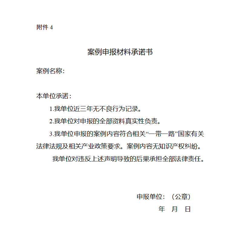 2. 每個申報依托單位限報送案例1個,申報案例完成時間應為近三年,并已取得良好實質性成效。提供的案例要具備創(chuàng)新性、示范效應、推廣前景好,具有顯著減排效應,符合“一帶一路”國家的產業(yè)政策、標準和相關法律,契合“一帶一路”國家可持續(xù)發(fā)展需求。案例評選指標附后(見附件1)。